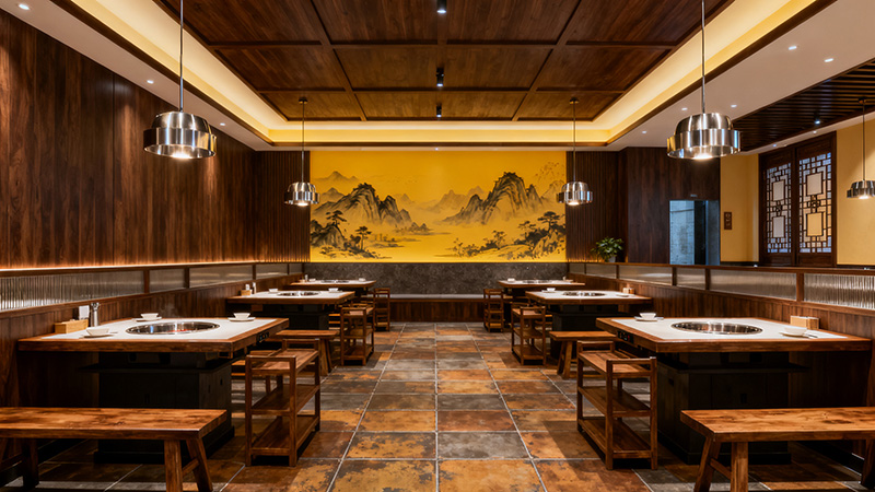 圖三是這張火鍋店裝修效果圖呈現(xiàn)出一種典雅且富有文化底蘊(yùn)的中式風(fēng)格。整體以暖黃色調(diào)為主,墻面大幅的山水壁畫為明亮的黃色,搭配木質(zhì)材料的深棕色,營(yíng)造出溫暖、舒適且極具傳統(tǒng)韻味的氛圍。這種色調(diào)組合讓人感覺親切,適合火鍋店熱鬧、融洽的用餐場(chǎng)景。