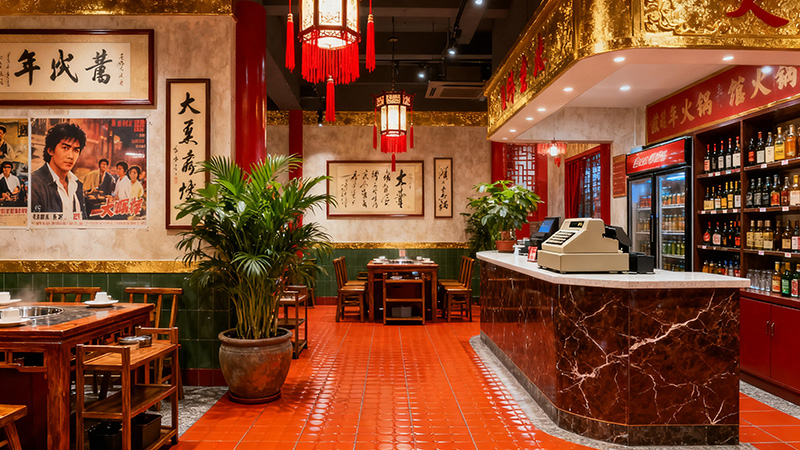 以紅色和金色為主色調(diào),紅色大面積應(yīng)用于柱子、燈籠和地面瓷磚,營(yíng)造出熱烈、喜慶的氛圍,契合火鍋熱鬧的用餐場(chǎng)景;金色作為裝飾線條和天花板圖案的顏色,提升了空間的華麗感與檔次。通過傳統(tǒng)字畫、復(fù)古海報(bào)、中式燈籠等元素,營(yíng)造出濃厚的復(fù)古懷,讓顧客仿佛置身于過去的時(shí)光,增添用餐的趣味性和體驗(yàn)感。