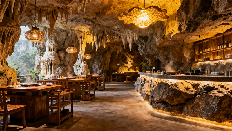 洞穴頂部和地面生長(zhǎng)著形態(tài)各異的鐘乳石和石筍,這些自然形成的景觀是店內(nèi)最獨(dú)特的裝飾元素,極大地增強(qiáng)了洞穴的真實(shí)感和神秘感。大面積保留和利用天然巖石,展現(xiàn)出原始的質(zhì)感和紋理,是整個(gè)設(shè)計(jì)的核心材質(zhì),突出了洞穴主題。
